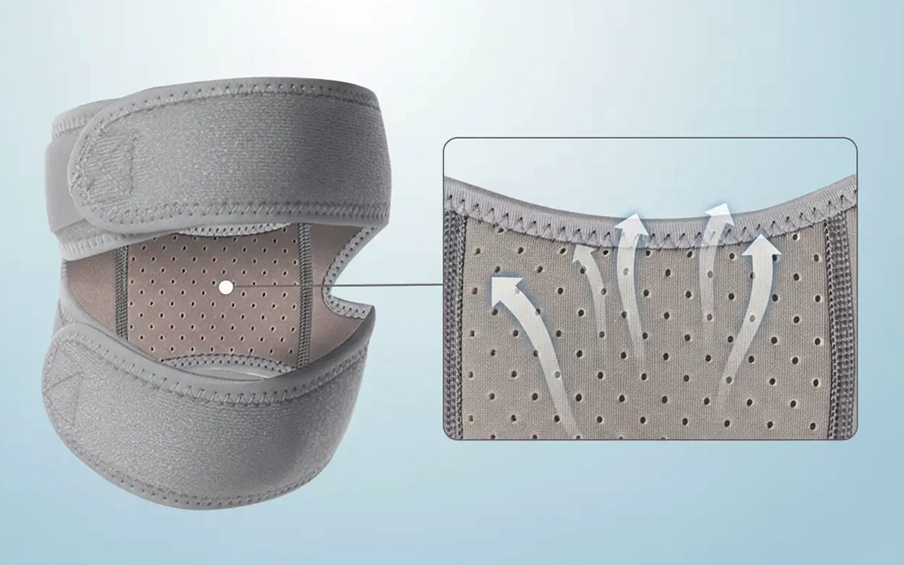 3D meshstof laat je huid ademen en voorkomt warmteophoping. Zweet droogt snel, zodat je knie licht en koel aanvoelt, de hele dag.