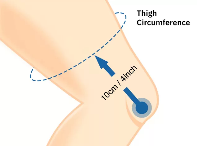 - 1. Buig je been in een hoek van 30° en meet de omtrek van je dij 10 cm (4'') boven je knieschijf.