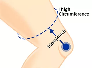 - 1. Buig je been in een hoek van 30° en meet de omtrek van je dij 10 cm (4'') boven je knieschijf.