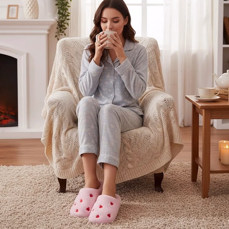 Geniet van een rustige avond thuis zonder koude tenen. Elke stap voelt zacht aan op zowel tapijt als harde vloeren. Het speelse hartjespatroon tovert een glimlach op je gezicht. Zachte zolen helpen je geruisloos door elke kamer te bewegen.