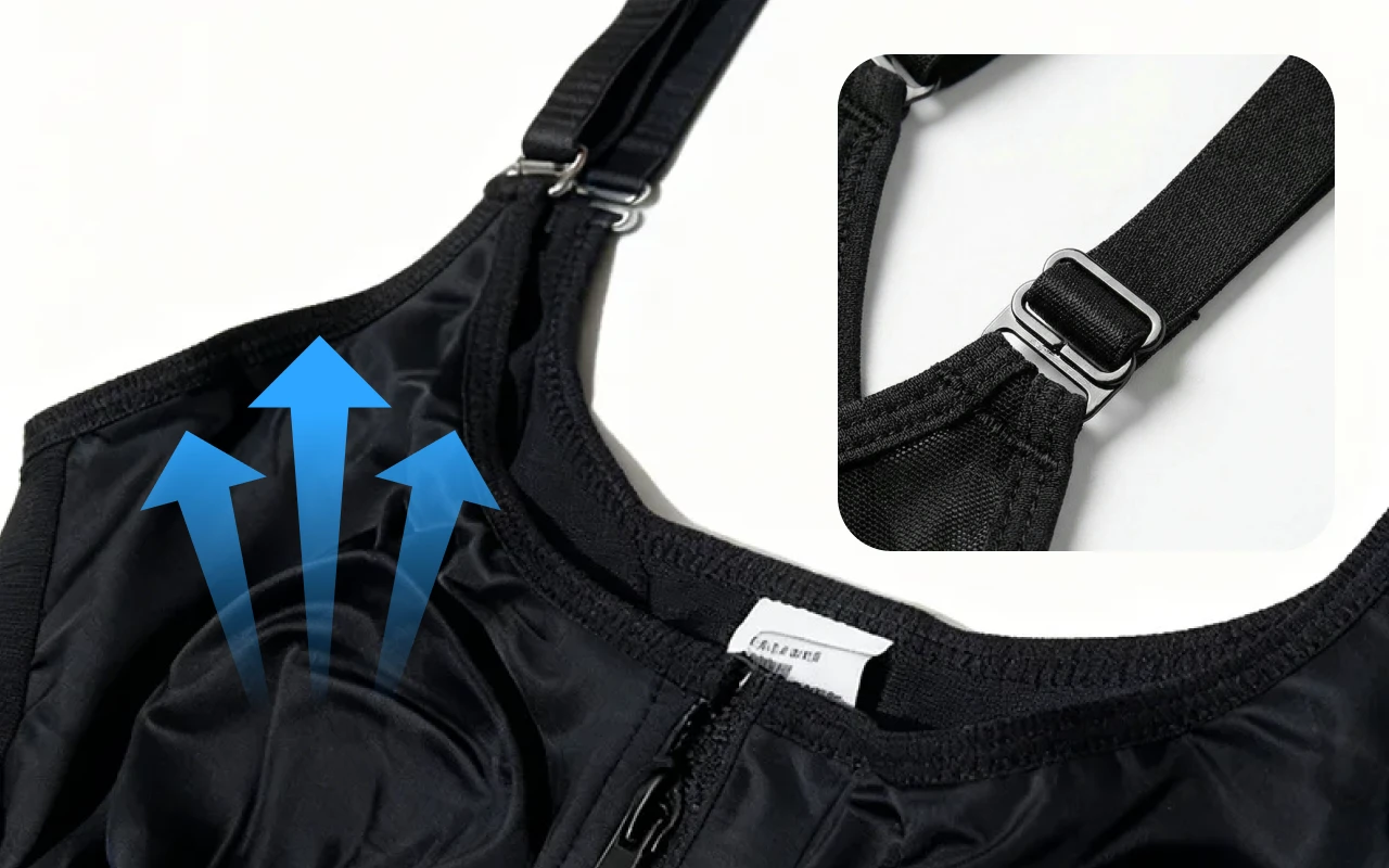 Zachte stof laat je huid ademen en biedt een veilig gevoel. Verstelbare bandjes zorgen voor een perfecte pasvorm voor elk lichaamstype.