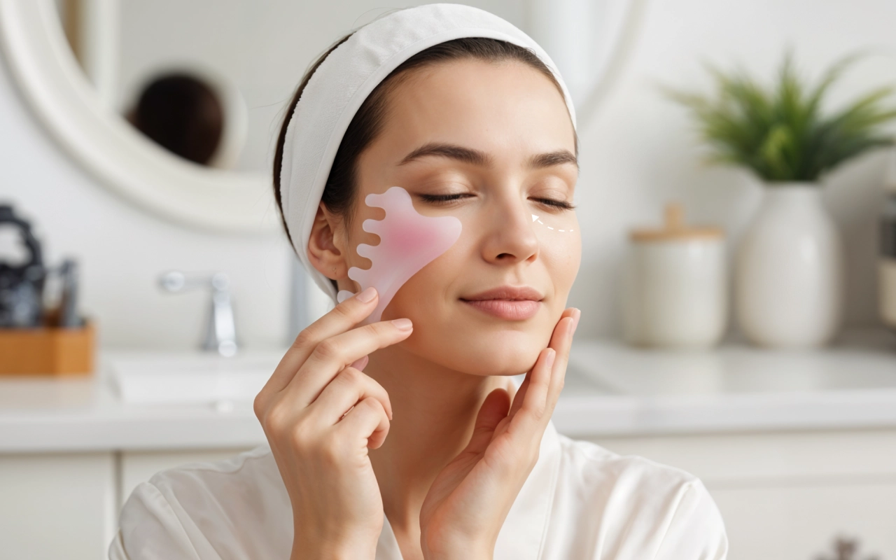 Je gezicht ziet er uitgerust uit na gebruik van de Ortorex Gua Sha. Zachte bewegingen verlichten spanning en verminderen wallen onder de ogen, waardoor je er fris uitziet.