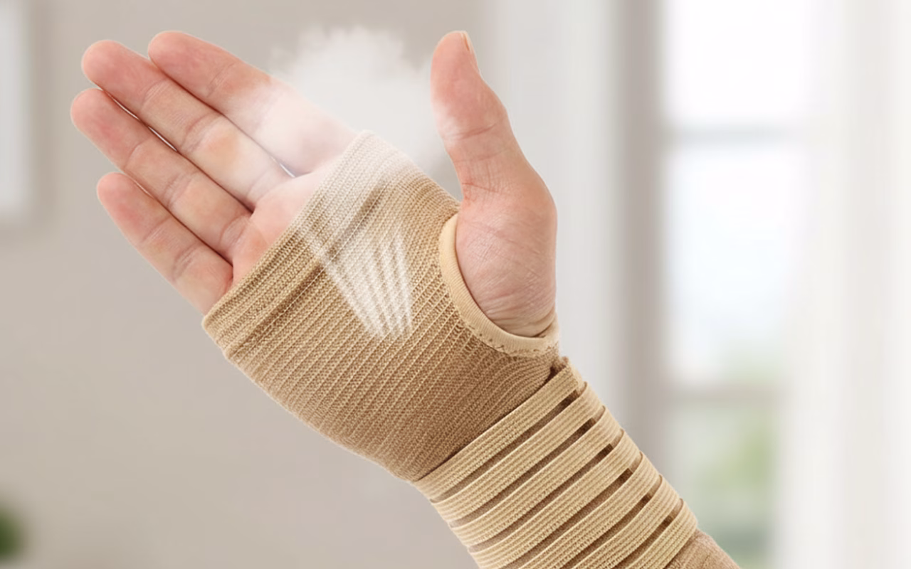 Het polsverband voelt zacht en flexibel aan, en mijn hand wordt niet zweterig, zelfs niet na een hele dag dragen. Het neemt mijn polspijn vrijwel direct weg.