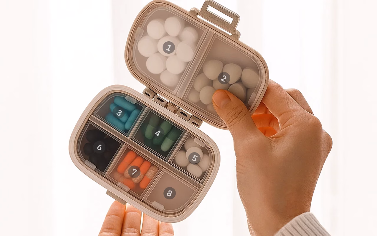 De vakjes zijn ruim genoeg voor al mijn supplementen, en ik vind het fijn dat elk vakje goed dichtklikt. Nooit meer pillen zoeken in mijn tas!