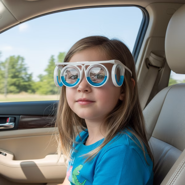 Geniet van een rustige reis na slechts tien minuten. Deze bril verlicht snel misselijkheid tijdens beweging.
