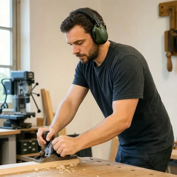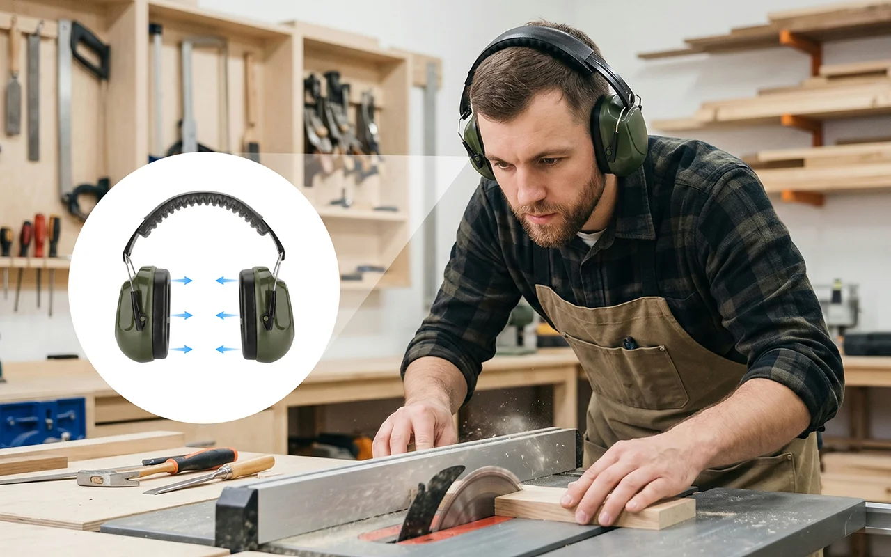 Ik draag deze in mijn houtwerkplaats met elektrische gereedschappen aan. De kussentjes zitten zacht, de band drukt niet, en ik kan uren comfortabel doorwerken.