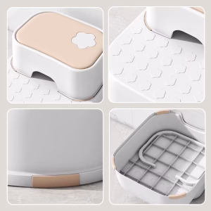 Antislippads houden het krukje stevig op de tegels. Geen zorgen meer over ongelukken of uitglijden tijdens drukke ochtenden.