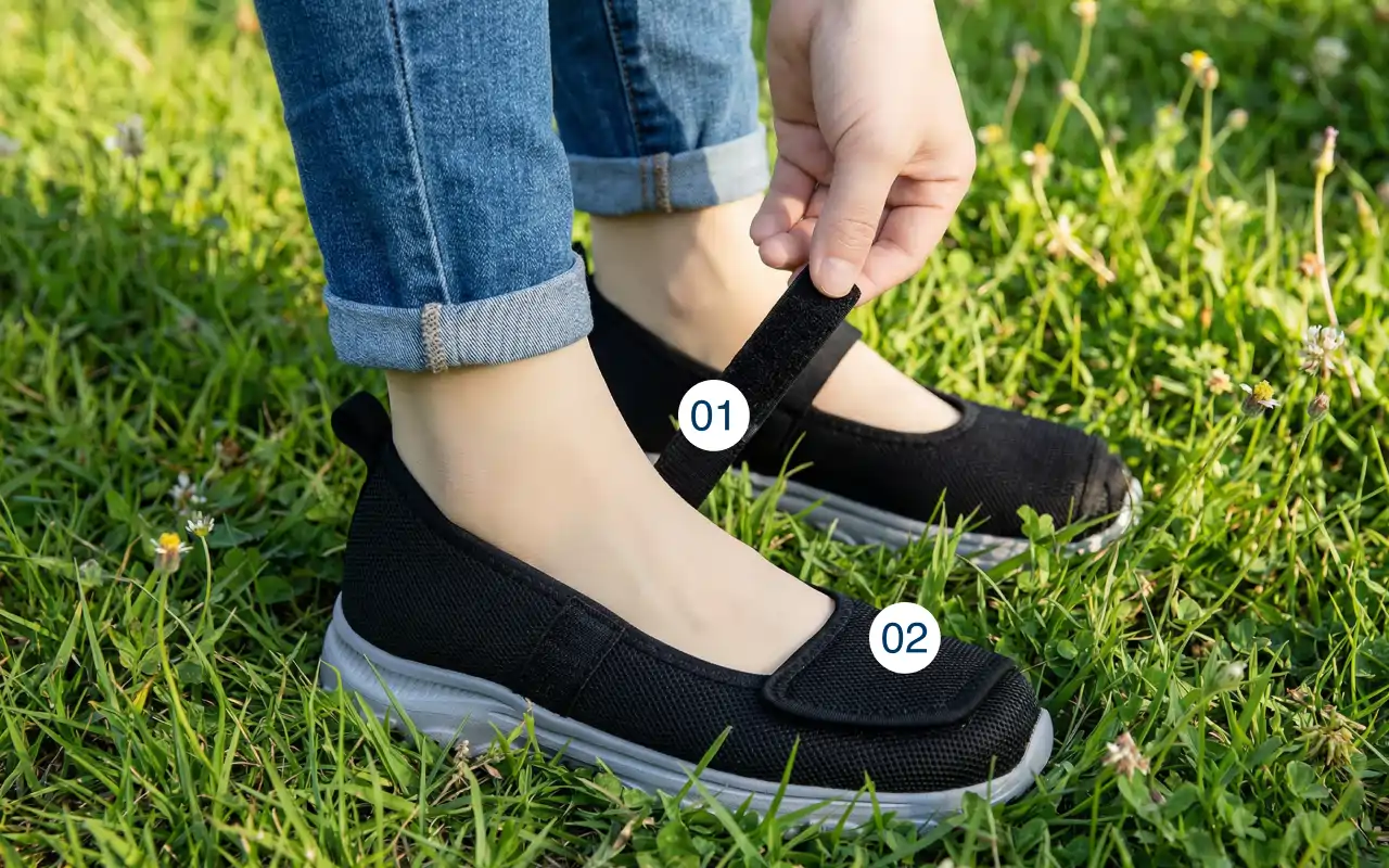 Een eenvoudige sluiting maakt snelle aanpassingen mogelijk wanneer de voet in de loop van de dag van grootte verandert. Dit helpt benauwdheid door zwelling of gevoeligheid te voorkomen.