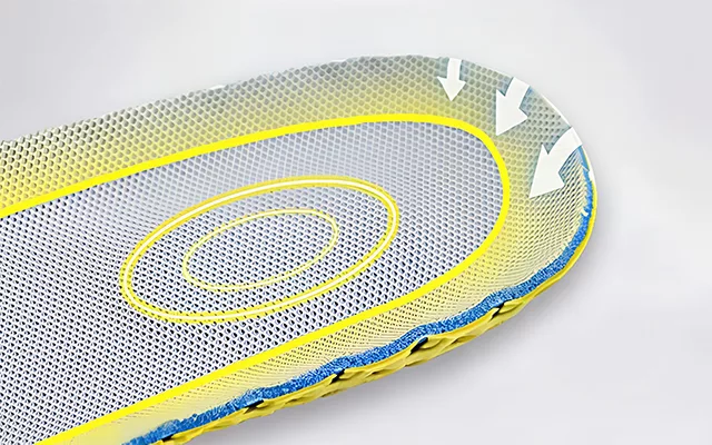 Het materiaal heeft een unieke structuur die lucht vrij laat stromen. Dit helpt zweten en voetengeur te verminderen.