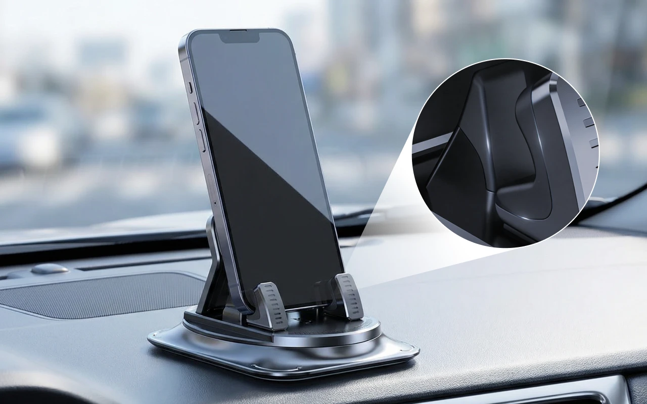 Rubberen pads voorkomen dat het apparaat verschuift of valt bij hobbels. Je apparaat blijft veilig, zelfs tijdens scherpe bochten.