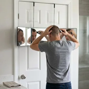 Met de driedelige spiegel kan ik mijn baard veel beter trimmen dan voorheen. Ik kan eindelijk de achterkant van mijn hoofd zien zonder me te moeten draaien.