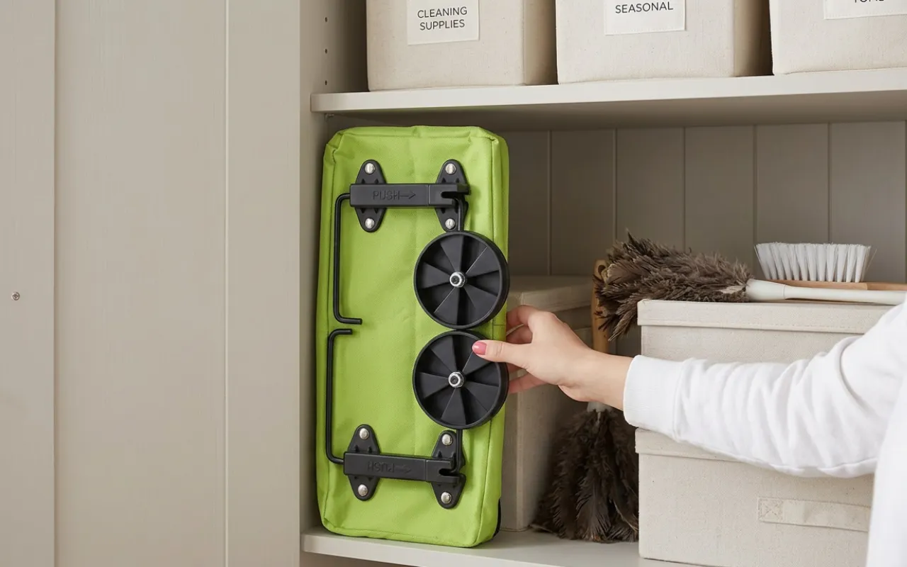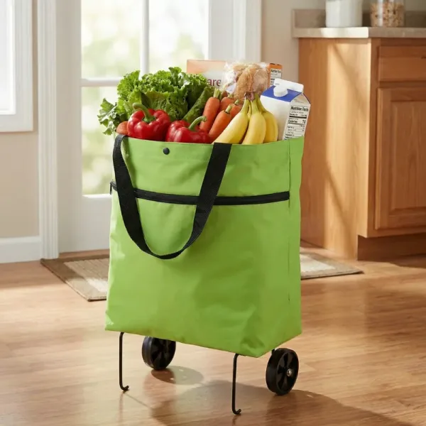 Deze kar gekocht na mijn schouderoperatie. Nu laad ik zware flessen en fruit in zonder me zorgen te maken. Hij klapt in een paar seconden in en schuift makkelijk naast de kledingkast.