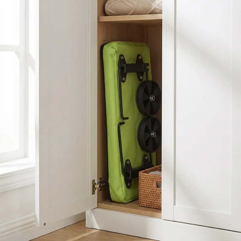 De draagtas vouwt op tot een slank pakket dat in smalle kasten past. Het lichte frame hangt netjes achter deuren, waardoor kostbare ruimte in de hal vrijkomt.