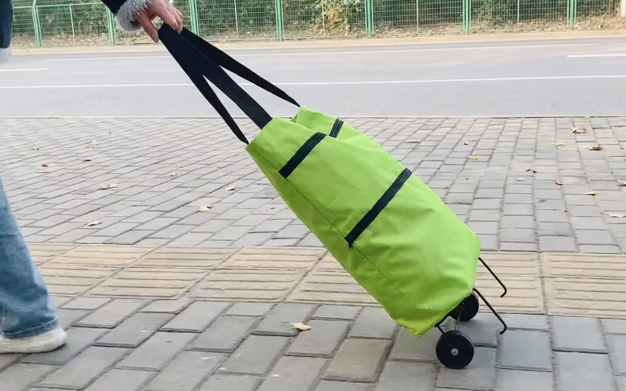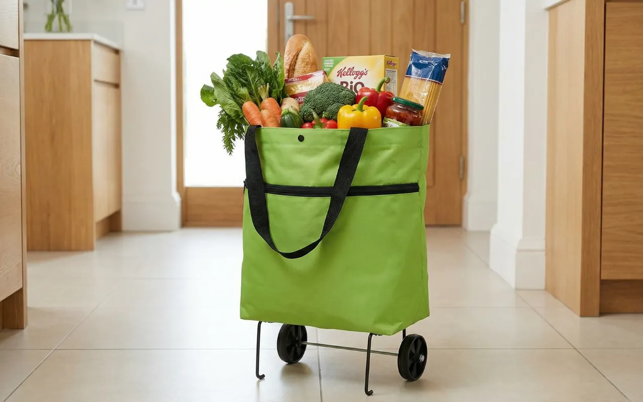 Ik kocht deze trolley nadat mijn kleinzoon zich zorgen maakte dat ik met tassen sjouwde. Nu rol ik alles soepel naar huis, zelfs over stoepranden. Hij schuift plat naast het schoenenrek.