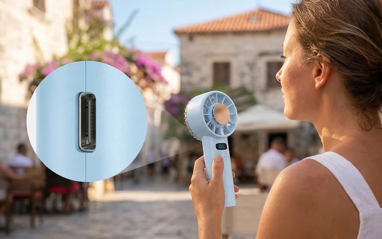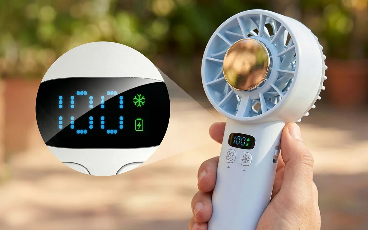 Ik gebruik deze handventilator tijdens voetbalwedstrijden buiten. Hij past in mijn crossbodytas, houdt me koel en het digitale display is super makkelijk af te lezen in zonlicht.