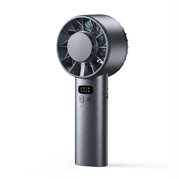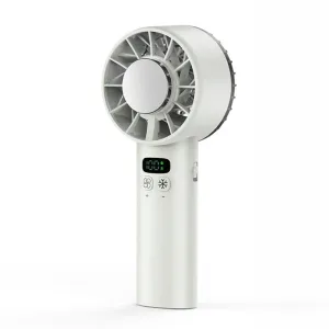 Ik bewaar deze zakventilator in mijn werktas voor drukke bussen. Met één knop verander je de snelheid, en het kleine display laat precies zien op welk niveau hij staat.