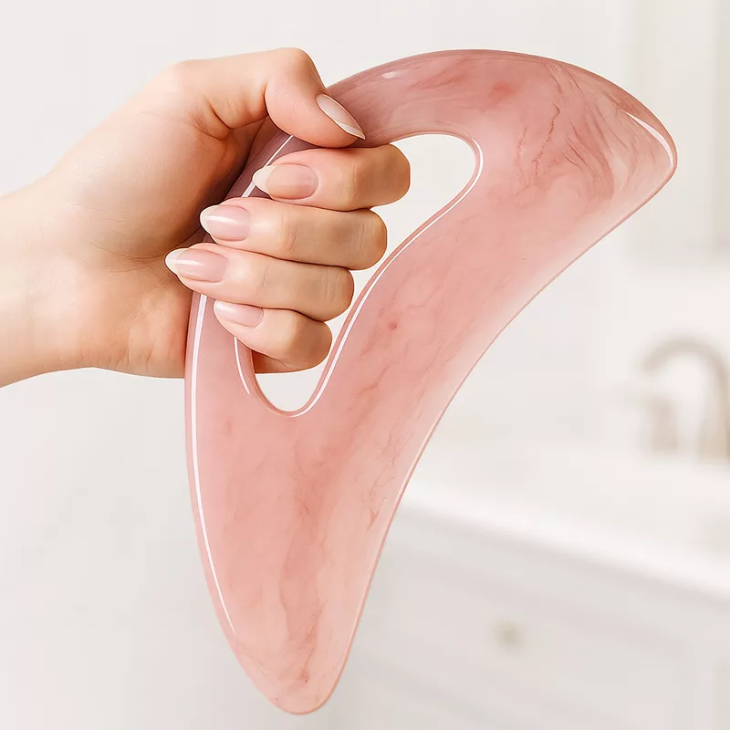 Ik reis veel, dus ik houd de Gua Sha in mijn tas. Hij is licht, super stevig, en helpt me ontspannen na lange uren in de auto.