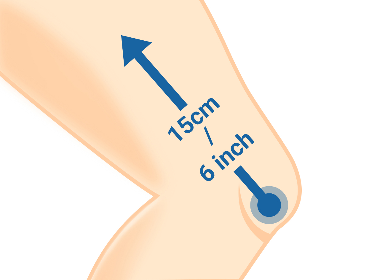 - 2. Plaats het meetlint 15 cm/6” boven het midden van je knieschijf en meet tot aan de enkel.