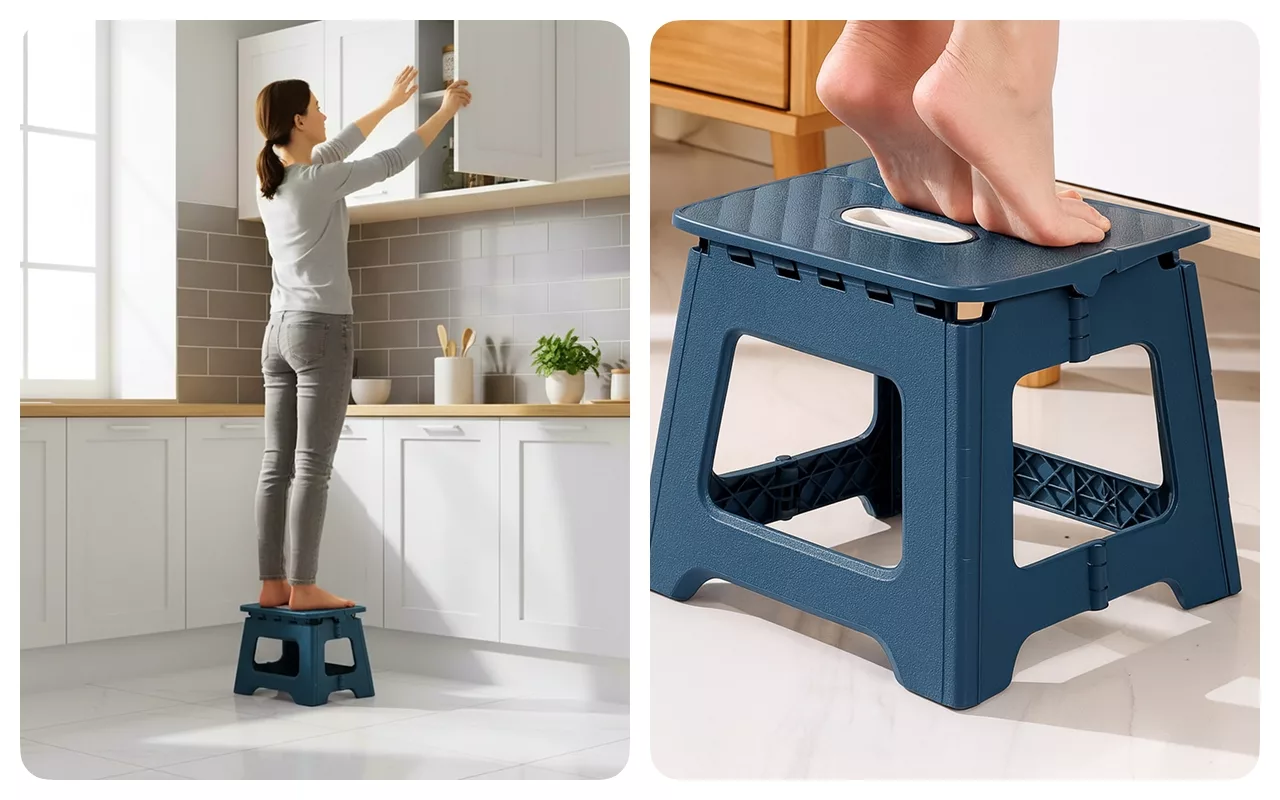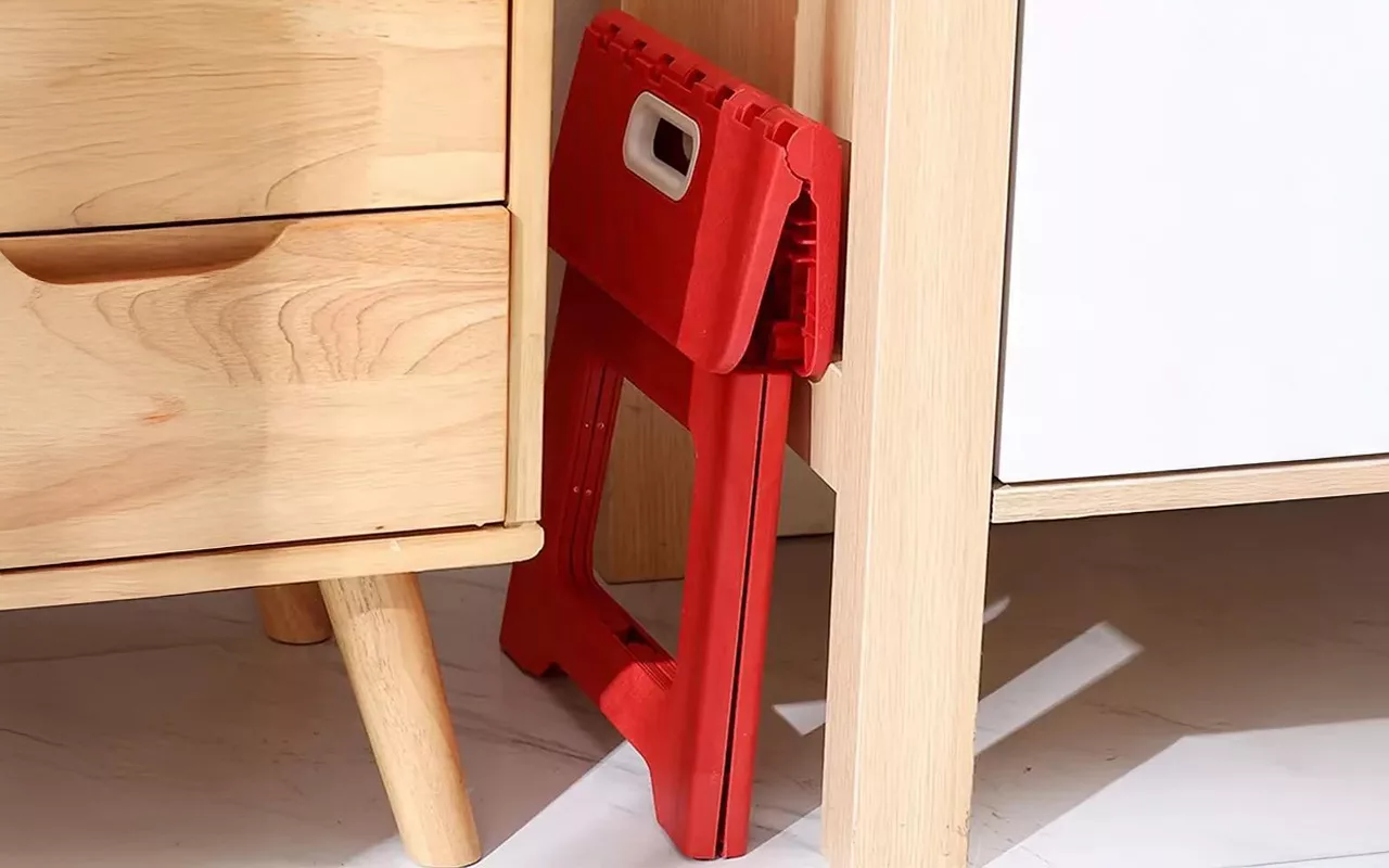 Het krukje is makkelijk mee te nemen en klapt snel open. Ik voel me altijd stabiel als ik erop sta om dingen uit mijn kast te pakken.