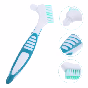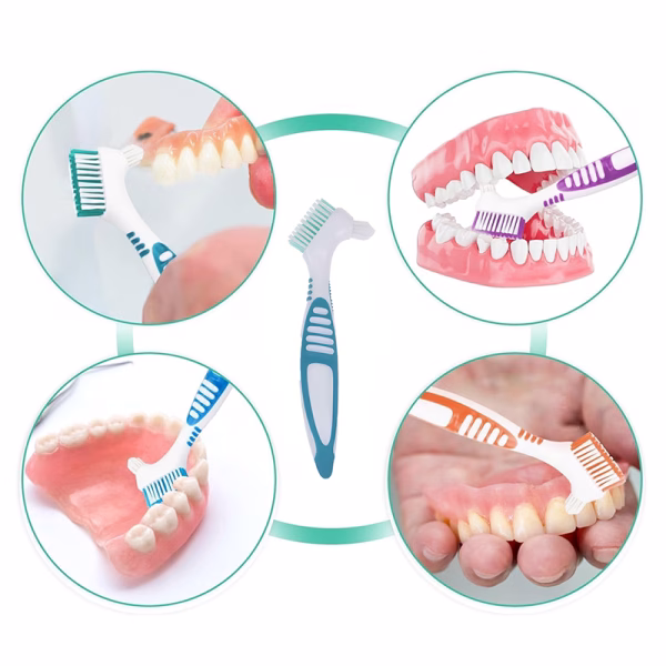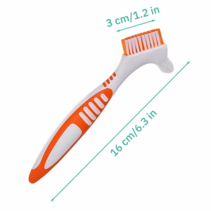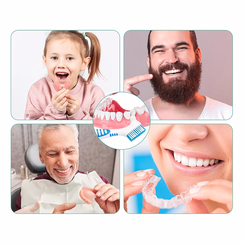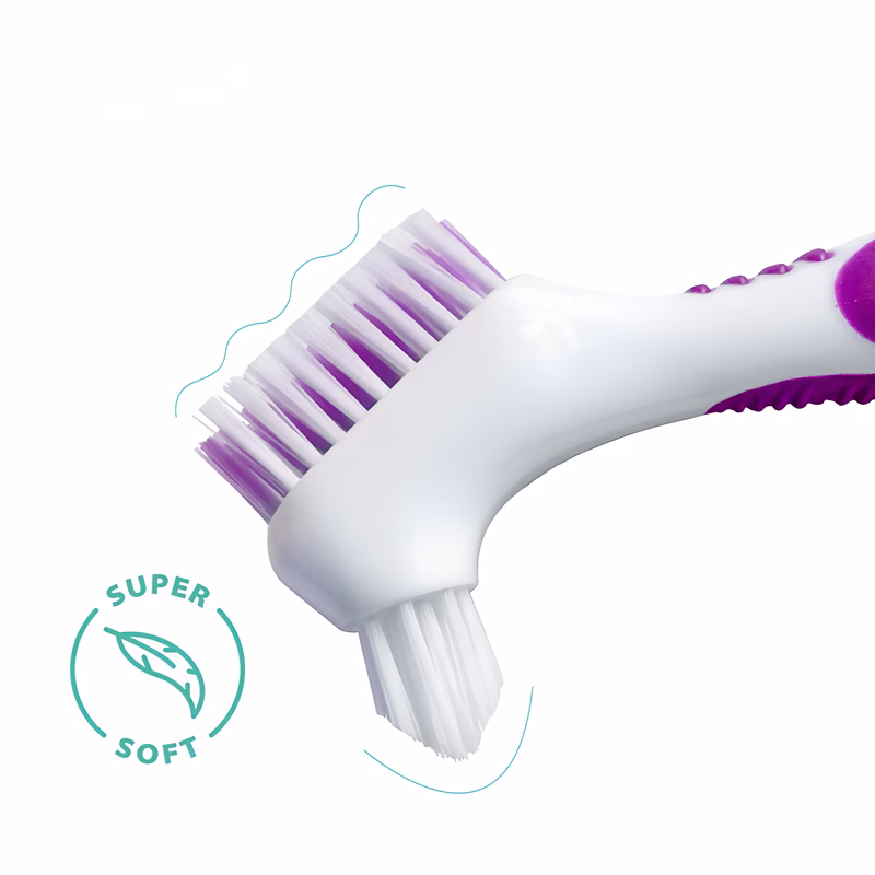 Dit hulpmiddel past precies in mijn hand en maakt schoonmaken snel. Ik vind de dubbele borstels fijn om overal bij te komen, en het voelt zacht aan op mijn kunstgebit.