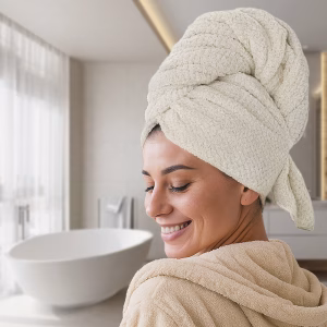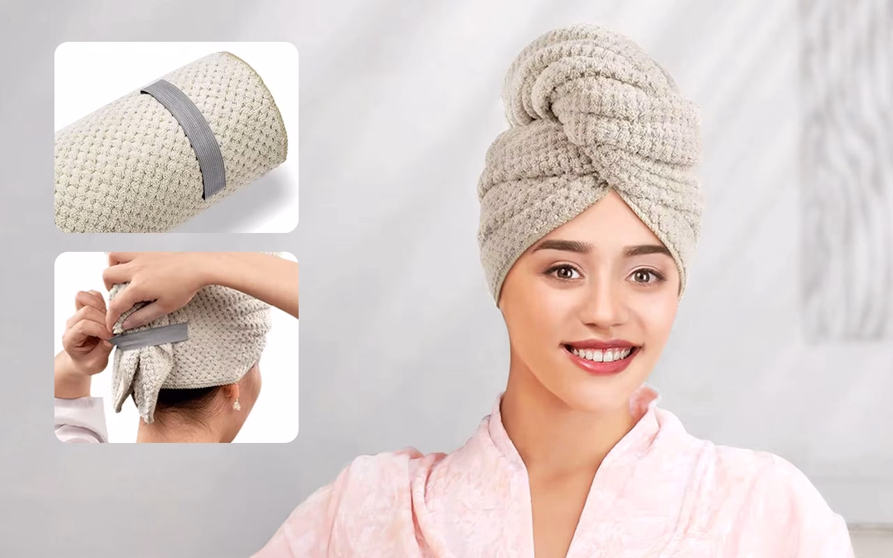 Deze handdoek is zo licht! Ik gebruik hem elke avond. Mijn haar is nooit meer pluizig en het bandje blijft goed zitten, zelfs als ik beweeg.