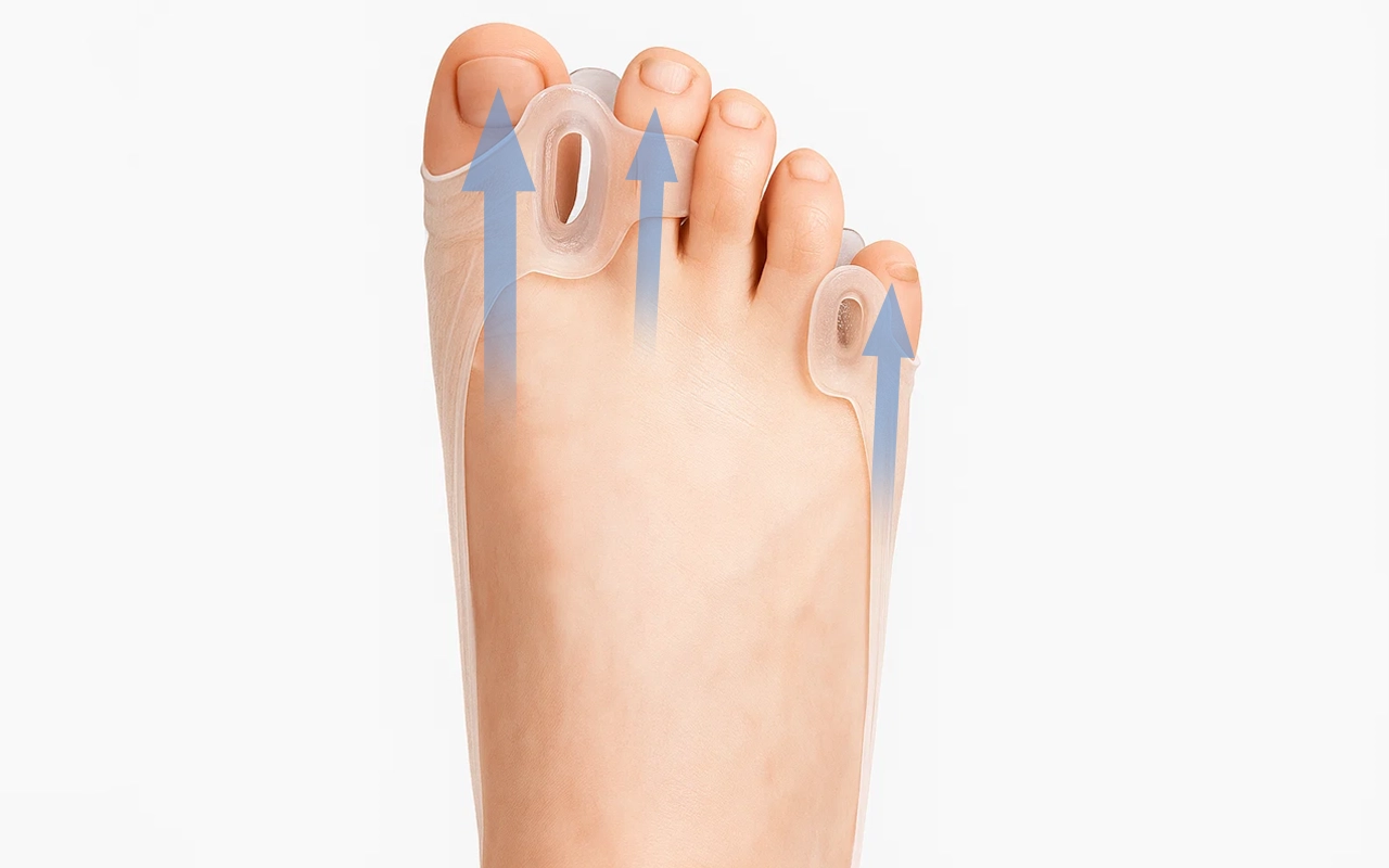 Helpt tenen recht te zetten zonder ongemak of stress te veroorzaken. Houdt ieder gewricht stabiel zodat bewegen soepel aanvoelt.