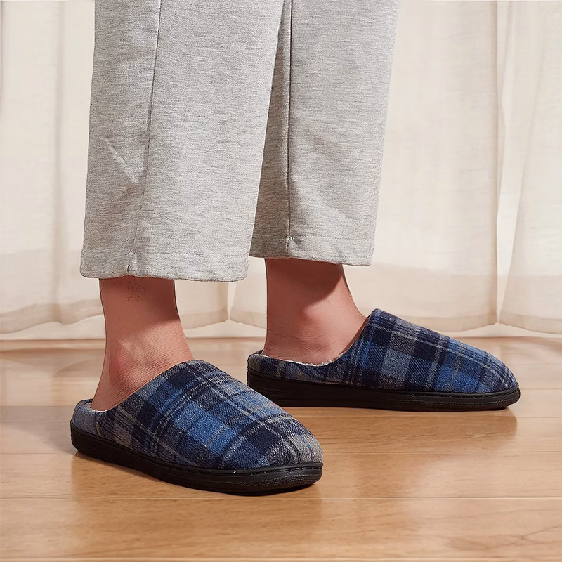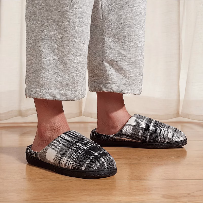 Het dragen van deze geruite pantoffels na het werk is heerlijk. Zacht van binnen, super makkelijk aan te trekken, en mijn hielen voelen nu volledig ontspannen.