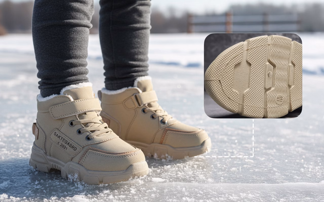 Speciaal ontworpen zolen zorgen voor extra grip en voorkomen ongewenst uitglijden. Kinderen kunnen veilig rennen, springen en lopen op gladde oppervlakken buiten.