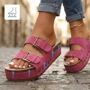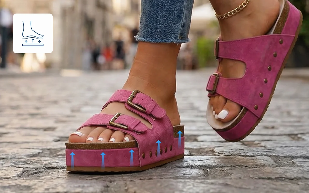 Het dikke platform absorbeert druk en vermindert snel vermoeidheid. Blijf langer actief zonder pijnlijke voetbogen of gevoelige hielen.