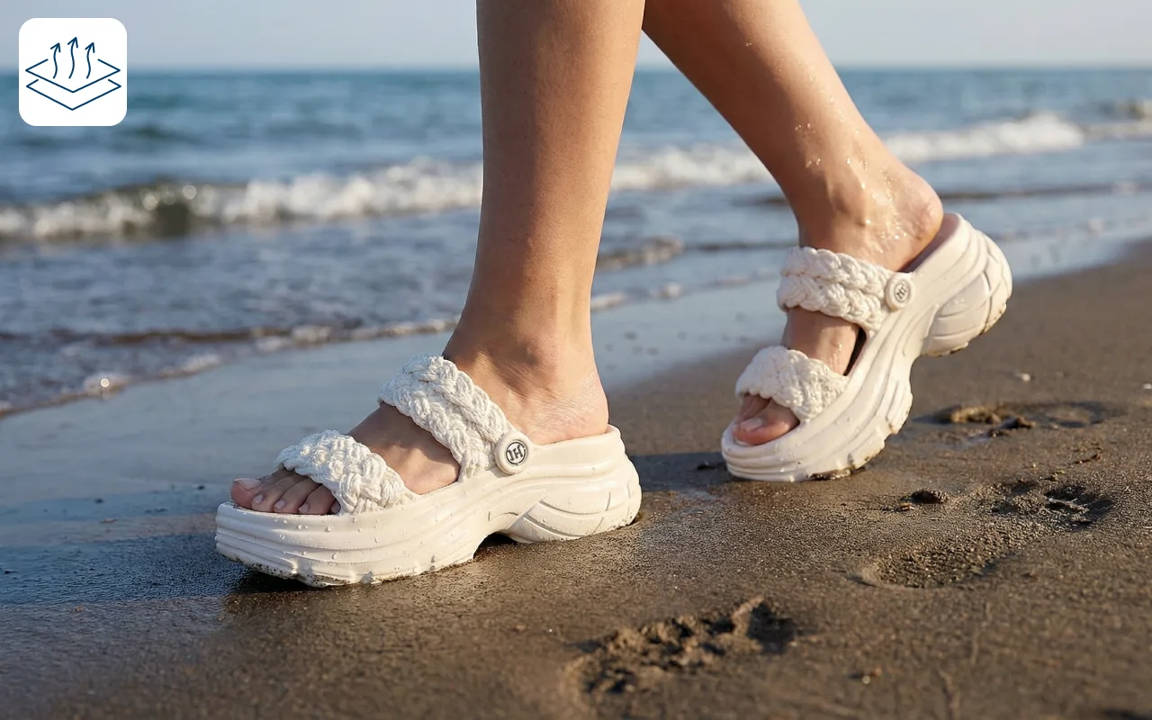 Vocht verdampt snel om je voeten overal fris te houden. Blijf comfortabel na wandelingen, boodschappen of tijd bij het zwembad.